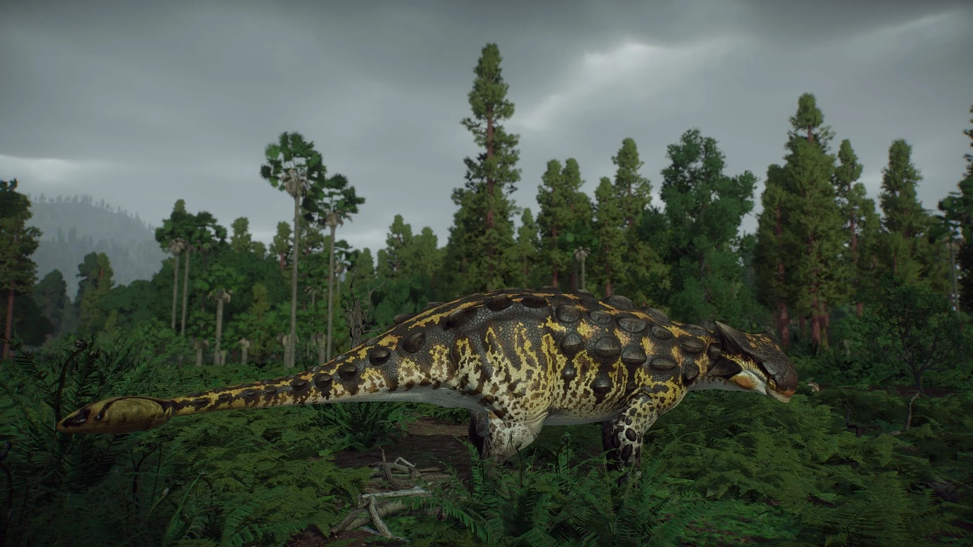 The three skins of Ankylosaurus in-game range from a mottled minty green in the "Marsh" skin, to monotone brown with white spots seen on "Peat", and a splotched striped skin with black patterning over an earthy yellow base on the skin "Levee".