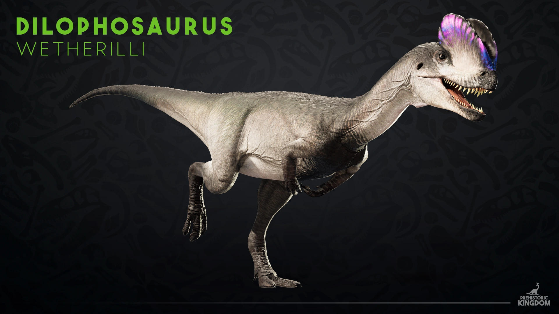 In Prehistoric Kingdom, Dilophosaurus has 3 integument options and 3 crest shapes. One feathered skin with a smooth crest, and two scaly skins, one with rough crests and iguana-like fleshy spikes on its neck and tail, and the other with crests with backward projections and no iguana spikes.