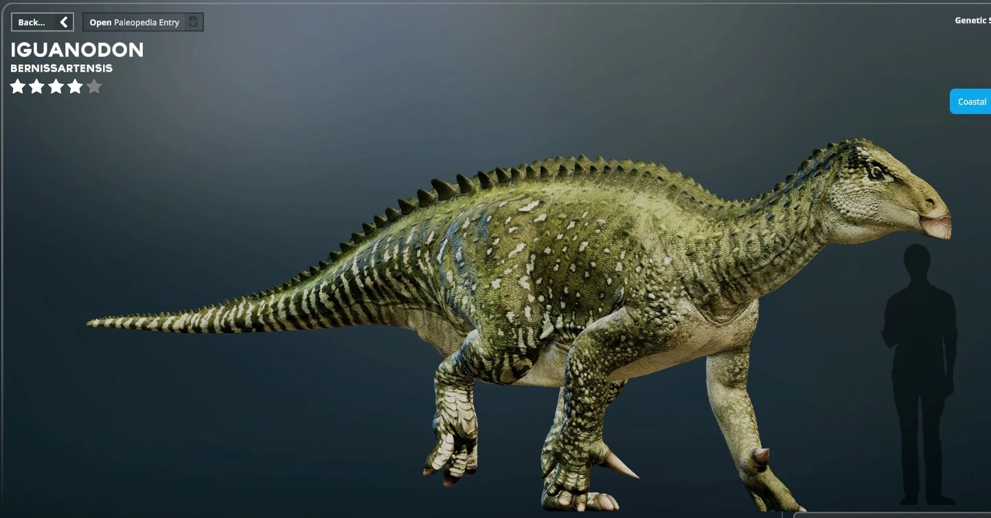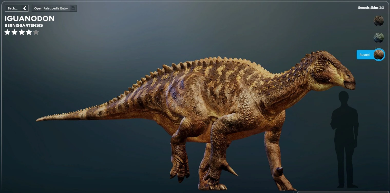 In Prehistoric Kingdom, Iguanodon's defensive capabilities are bolstered by speculative strings of large feature scales across its back and sides. Although smaller than most of the hadrosaurs in-game, Iguanodon is still a decently large animal.